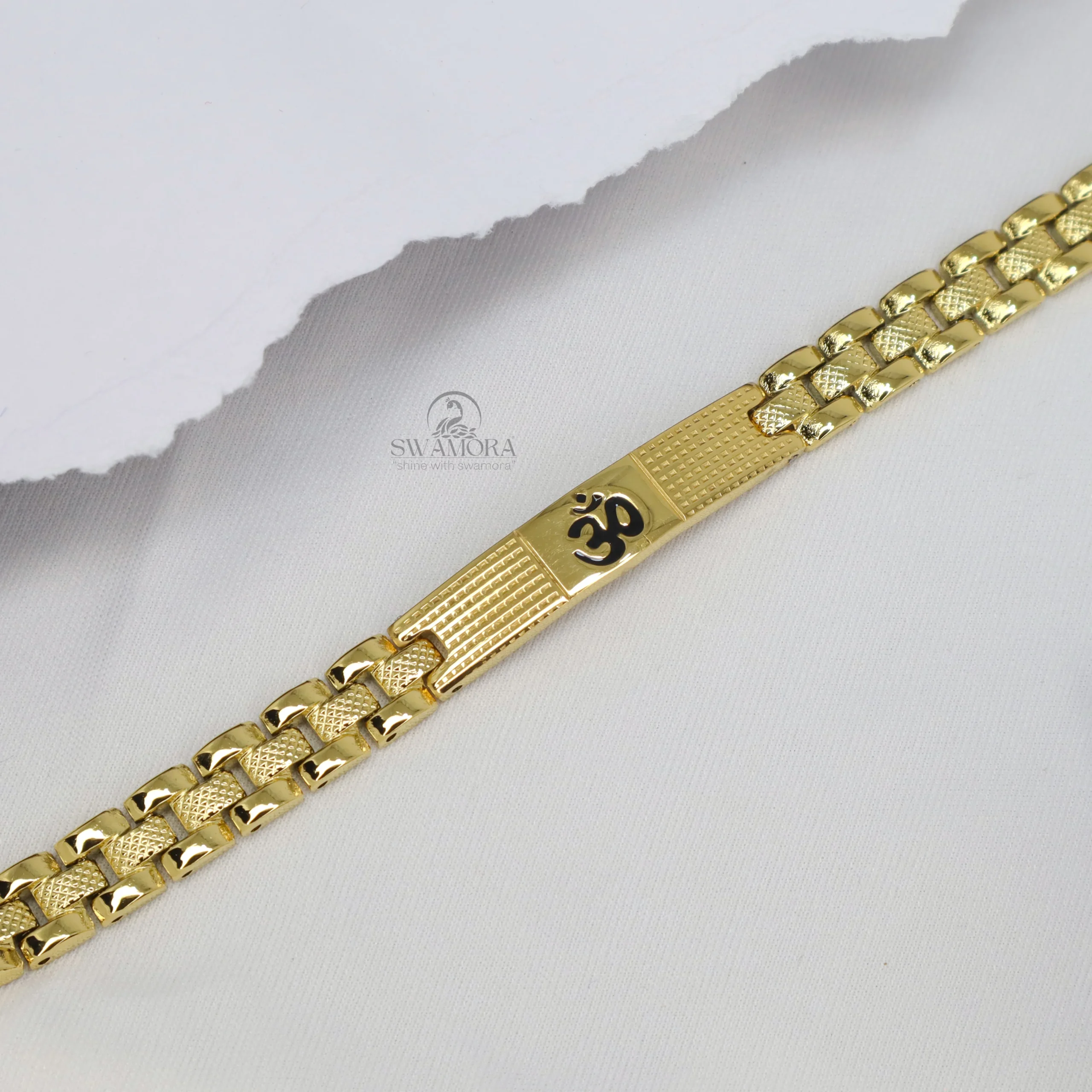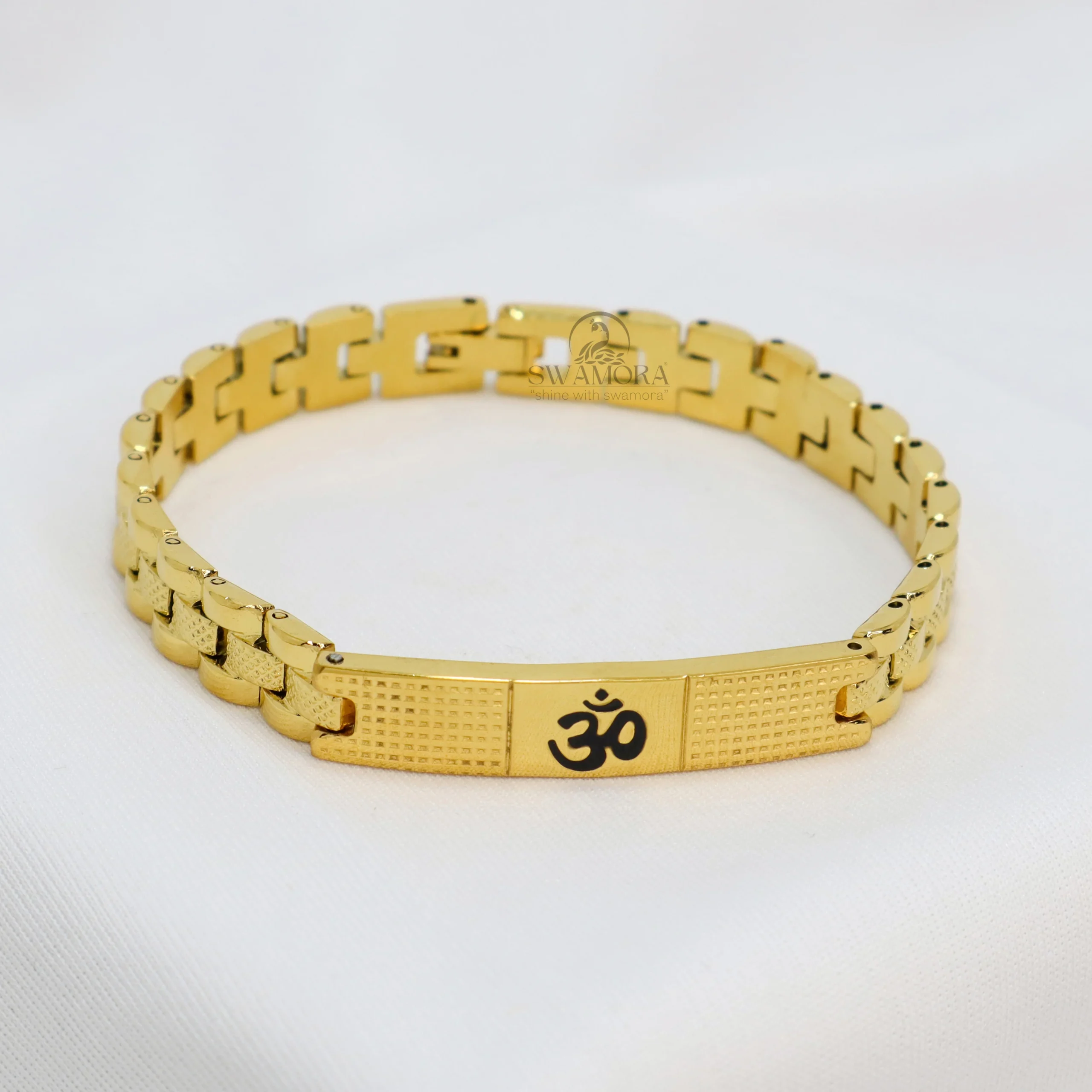 Introducing a beautiful and eye-catching gold-plated bracelet! This bracelet features a special design and the sacred ‘Om’ symbol is engraved in the center, representing positive energy and peace. It’s made from high-quality material, ensuring it will last for a long time.