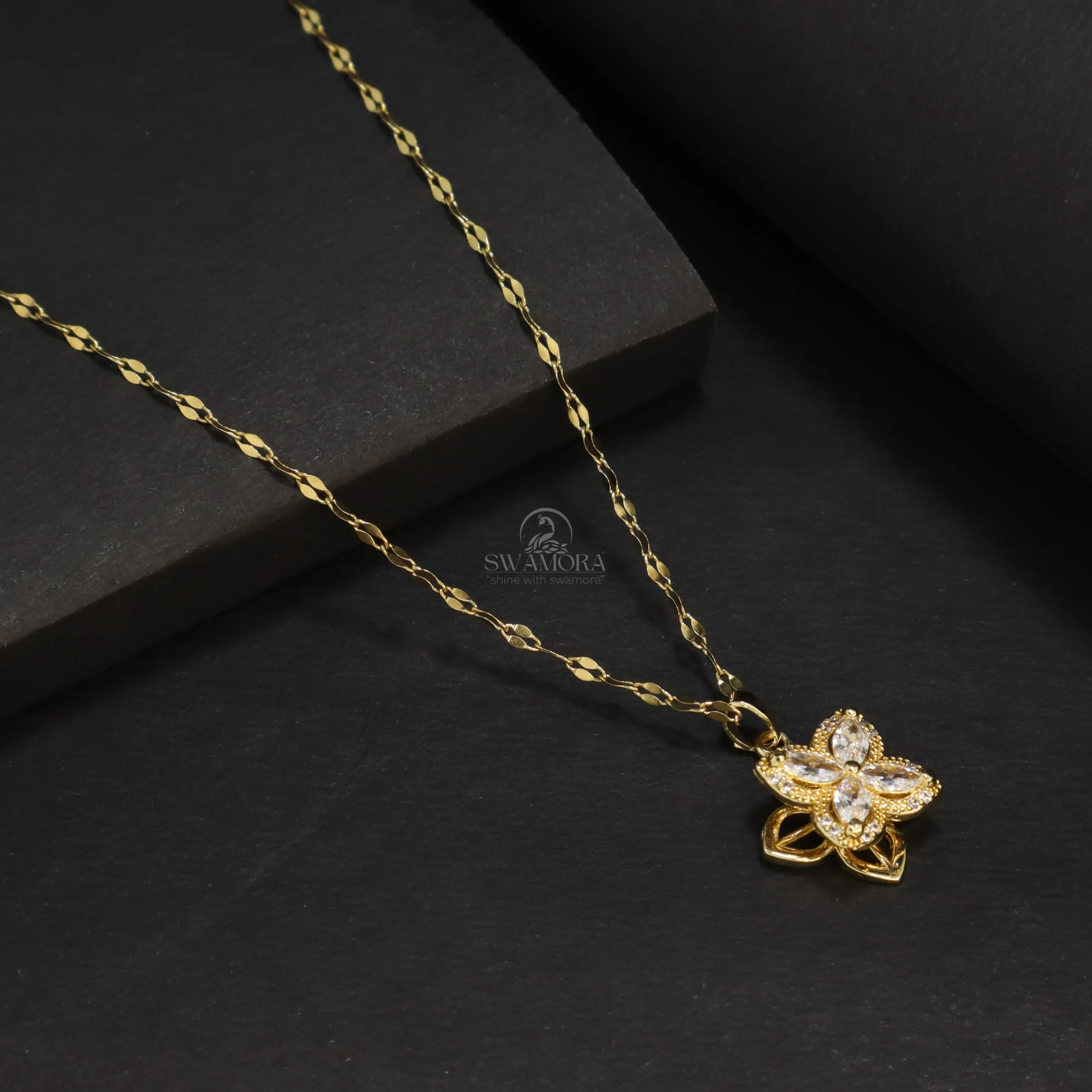 Introducing a beautiful and eye-catching gold-plated necklace for women! This necklace features a special four-petal rotating flower pendant. Sparkling cubic zircon crystals are set in the center and on the petals of this flower. The rotating feature gives this pendant a playful and attractive look. The chain is made from high-quality material, providing a lovely golden shine and ensuring it lasts for a long time.